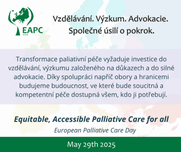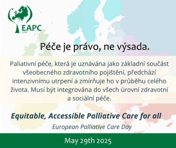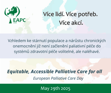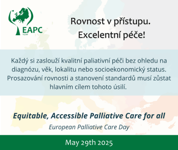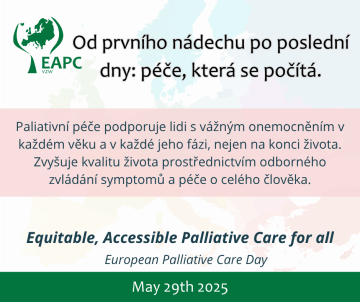 29. května 2025 slavíme vůbec první Evropský den paliativní péče (European Palliative Care Day). Tento den vyhlášený Evropskou asociací pro paliativní péči (EAPC) si klade za cíl zvýšit povědomí o významu paliativní péče pro jednotlivce i celou společnost. ČSPM ČLS JEP se k této iniciativě hrdě připojuje.